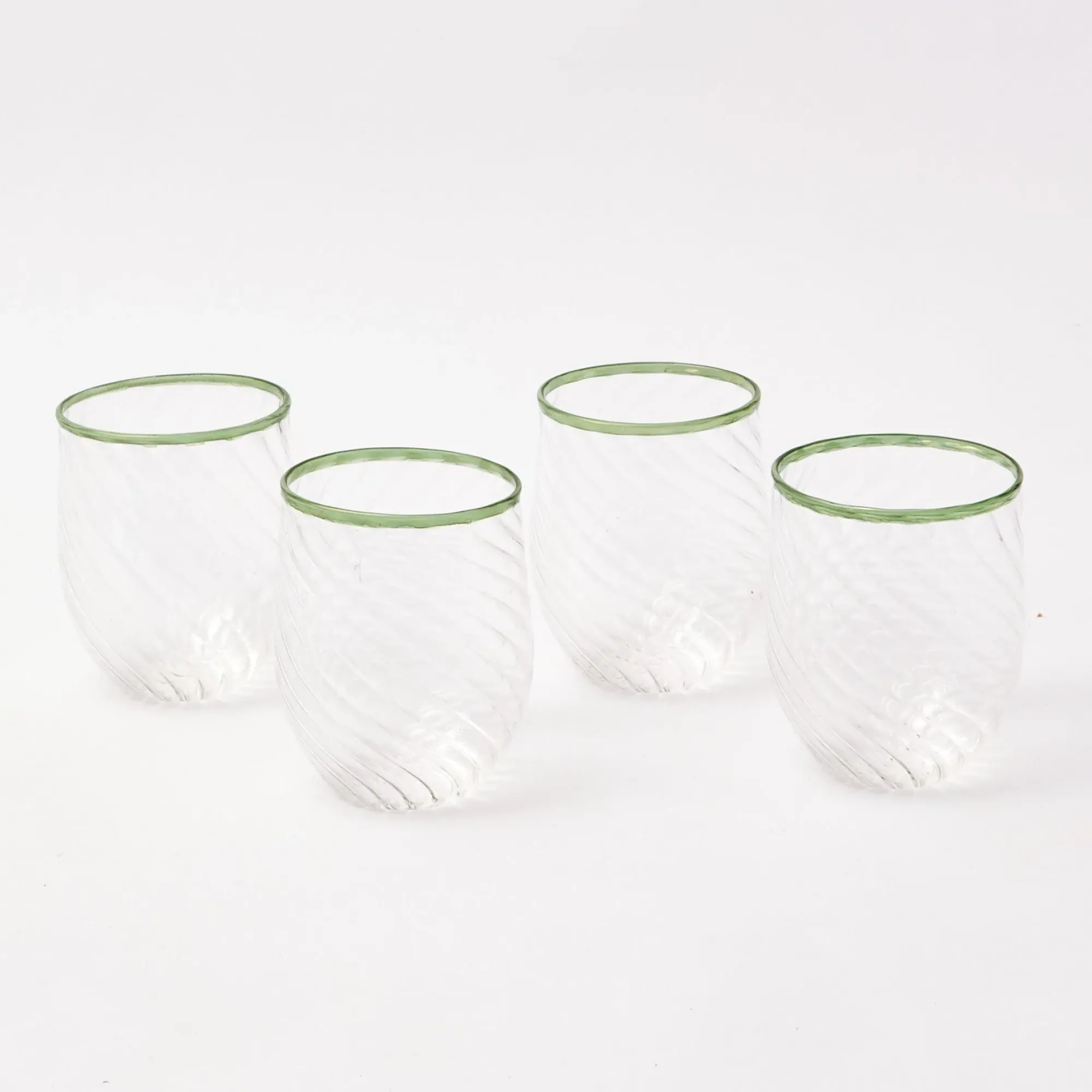 This Set Of Delightful Clear Swirled Water & Wine Glasses, Hand Blown By Artisans, Come With Rich Olive Green Rims.Perfect In Candlelight, These Delicate Glasses Look Elegant Laid With Our Christmas Garland Tablecloth, Liberty Forest Green Placemats And Napkins & Reindeer Dinner Plates.Set Includes:X4 Olive Rim Swirl Wine Glasses (7Cm Wide, 18Cm High) X4 Olive Rim Swirl Water Glasses (8Cm Wide, 10Cm High) Due To Their Charming Handblown Nature, The Glasses Can Differ Slightly In Size And Shape.Hand Wash Only.
