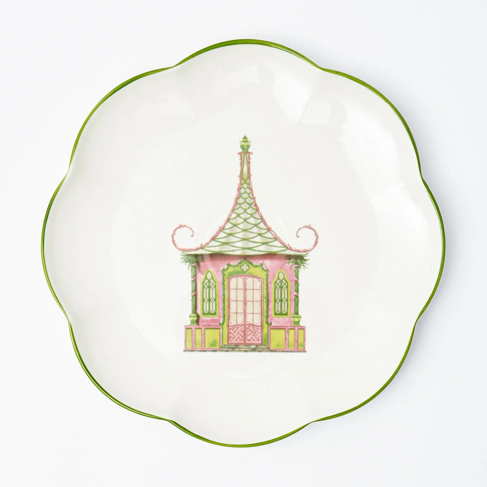 With A Fresh Green Hand Painted Rim, Our Exclusive Scalloped Dinner Plate Features An Elegant Pink Pagoda.Designed By Alice’s Mother Serena, This Plate Is Matched With Our Pink & Green Scalloped Pagoda Starter Plate, Pink Bamboo Trellis Tablecloth & Pink Penelope Linen.Size: 26 Cm